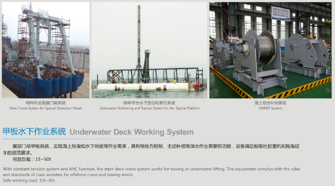 艉部門吊甲板系統(tǒng),實(shí)現(xiàn)海上拖曳和水下吊放等作業(yè)需求,具有恒張力控制、主動(dòng)補(bǔ)償?shù)壬钏鳂I(yè)需求的功能,設(shè)備滿足船級(jí)社起重機(jī)和拖曳絞車的規(guī)范要求。