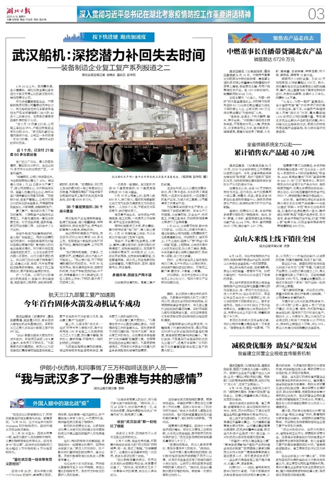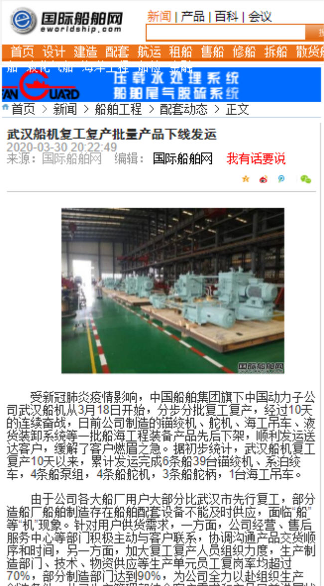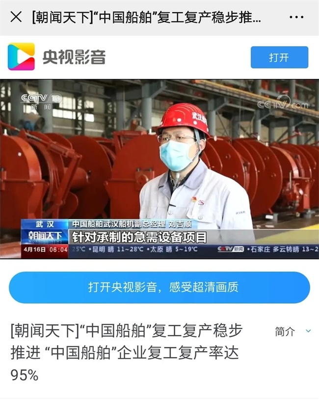中國船舶武漢船機在疫情期間以及復(fù)工復(fù)產(chǎn)以來,全力以赴打好疫情防控阻擊戰(zhàn)和生產(chǎn)經(jīng)營攻堅戰(zhàn),產(chǎn)能達到90%以上,多臺設(shè)備先后密集交付,生產(chǎn)經(jīng)營呈現(xiàn)較好勢頭。國內(nèi)多家媒體紛紛聚焦武漢船機,激勵公司全體員工團結(jié)奮進、克難攻堅,以昂揚的斗志推動企業(yè)高質(zhì)量發(fā)展。