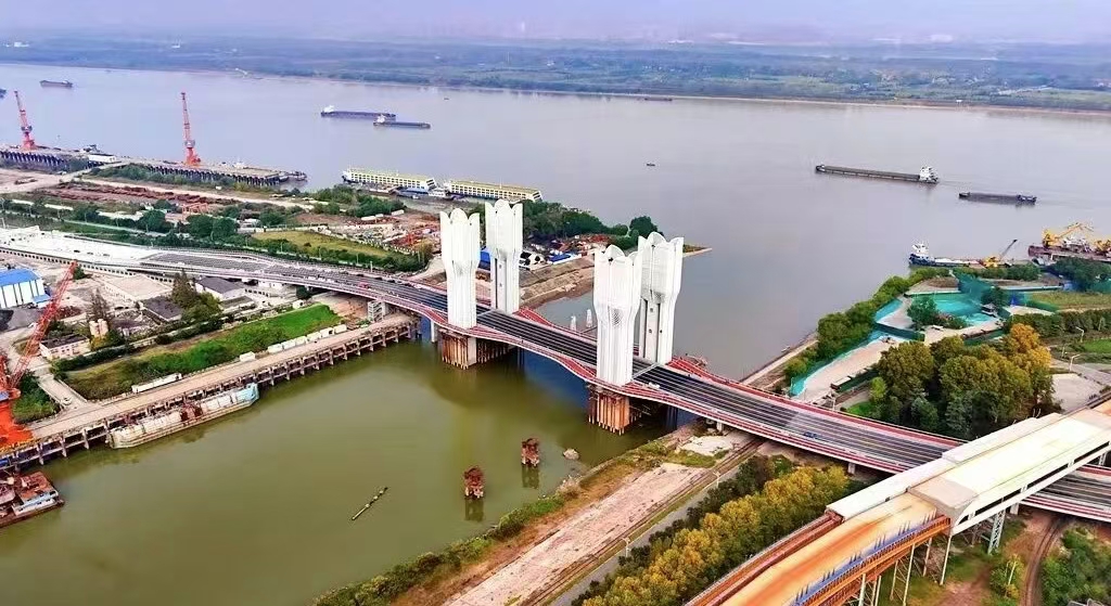 右岸大道開啟橋位于武漢市長江以南武鋼工業港,橋面可升降部分全長104米,塔柱斷面最寬處46.2米,提升重量2650噸,最大可提升27米,上述四項數據在同類型開啟橋梁中處于領跑地位,居亞洲第一。該橋既是長江主軸右岸大道向北延伸的重要組成部分,更是長江北湖生態綠色發展示范區的交通主動脈和濱江景觀軸,對完善區域路網結構、推動生態保護與產業發展深度融合具有重要意義。