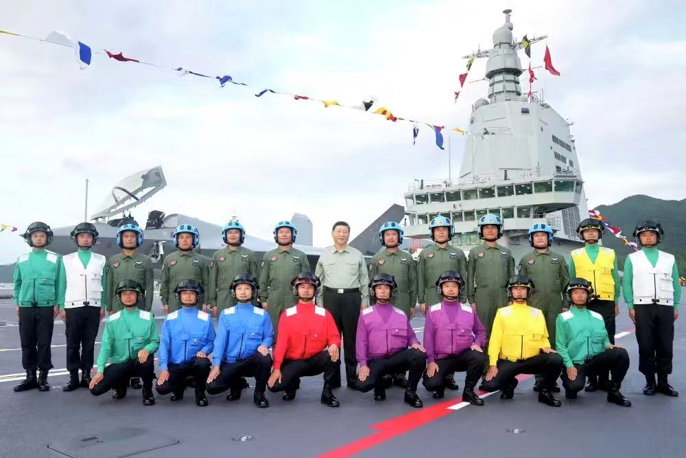 11月5日,我國第一艘電磁彈射型航空母艦福建艦入列授旗儀式在海南三亞某軍港舉行。中共中央總書記、國家主席、中央軍委主席習近平出席入列授旗儀式并登艦視察。這是習近平同艦載機飛行員、航空保障人員合影留念。新華社記者 李剛 攝